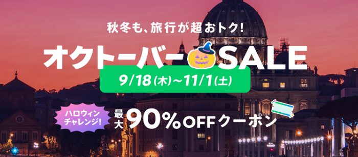 さらに、海外ツアーに使えるハロウィンチャレンジクーポン(初めての予約者限定)も配布中!