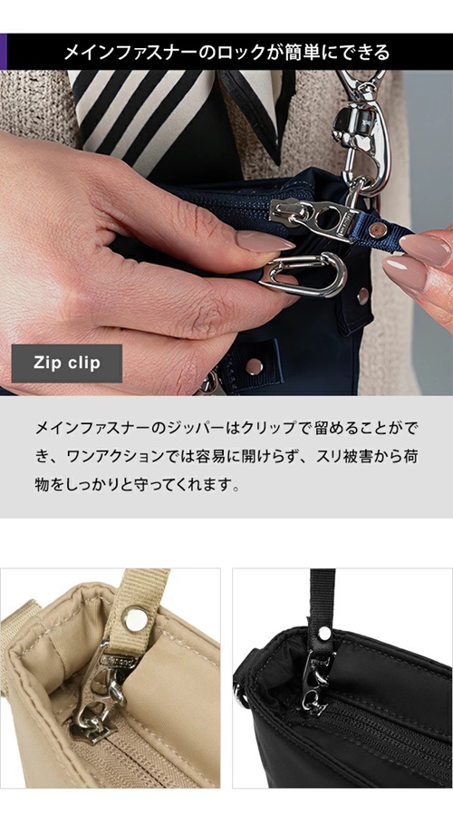ジッパーはクリップで留めることができ、ワンアクションではジッパーを開けられないセキュリティ機能付きです。