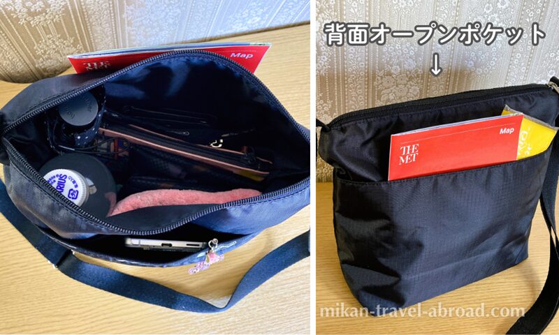 前面のファスナーポケットにスマホ、背面のオープンポケットに地図とティッシュを入れておくと、観光中でもサッと取り出せて便利です。