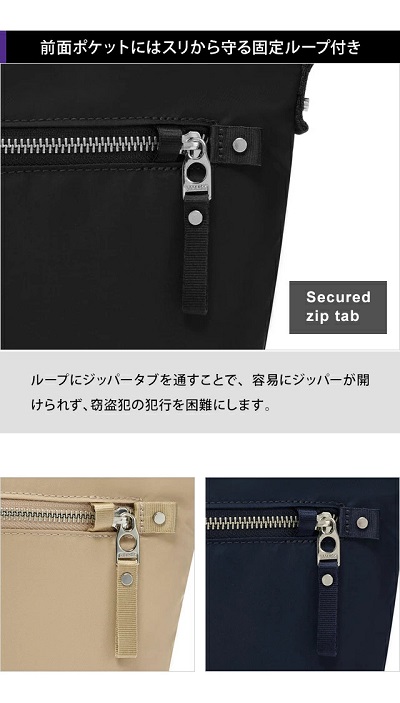 海外旅行先では、観光客を狙ったスリや置き引きが多発しています。被害を防ぐために、以下のような防犯機能が備わったバッグを選びましょう。