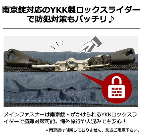 - メインファスナーは、南京錠がかけられるYKKロックスライダー