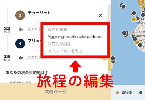 目的地と目的地の間に飛行機マークがあり「含まれるフライト」と書いてあるところです。